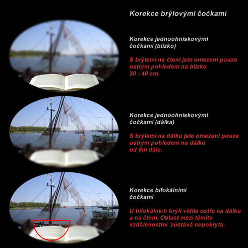 U bifokálních čoček je spojena se „základní“ čočkou ještě jedna „přídavná čočka“. V části brýlové čočky, kde má účinnost základní čočka, má stejné optické vlastnosti jako odpovídající čočka jednoohnisková. Část brýlové čočky, kde působí dohromady „základní“ společně s „přídavnou čočkou“, nazýváme přídavný díl. Základní díl je většinou používán jako díl do dálky, přídavný díl je buď do základního dílu zabroušen, nebo (s jiným indexem lomu) zataven a je používán do blízka. Rozdíl dioptrických hodnot do dálky a do blízka se nazývá adice. Přídavné díly mohou mít různou velikost a tvar. Určitou nevýhodou bifokálních čoček je skok obrazu. Pojmem skok obrazu se rozumí posunutí pozorovaného objektu při výměně pohledu z dálky do blízka.Po krátké době návyku si uživatel skok obrazu prakticky neuvědomuje. Výběr určitého typu bifokální čočky záleží např. na povolání zákazníka nebo na výběru brýlové obruby a také na jeho vkusu. S výhodami a nevýhodami těchto čoček Vás rádi seznámíme.
