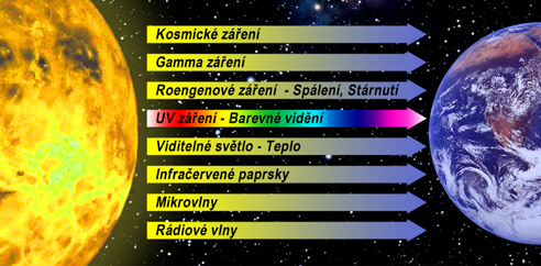 Rozdělení UV záření na tři složky pojmenované UVC, UVB a UVA.